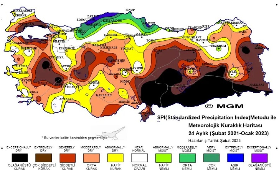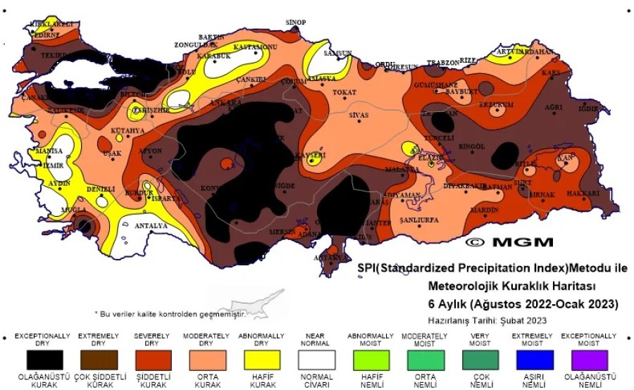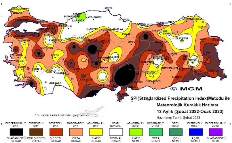 Meteoroloji Genel Müdürlüğü'nün sitesinde kuraklık haritaları güncellendi. Sonuçlar pek de iç açıcı değil. Ocak 2023'te ülkenin büyük bir kısmında şiddetli kuraklık yaşandı açıklaması yaptı.