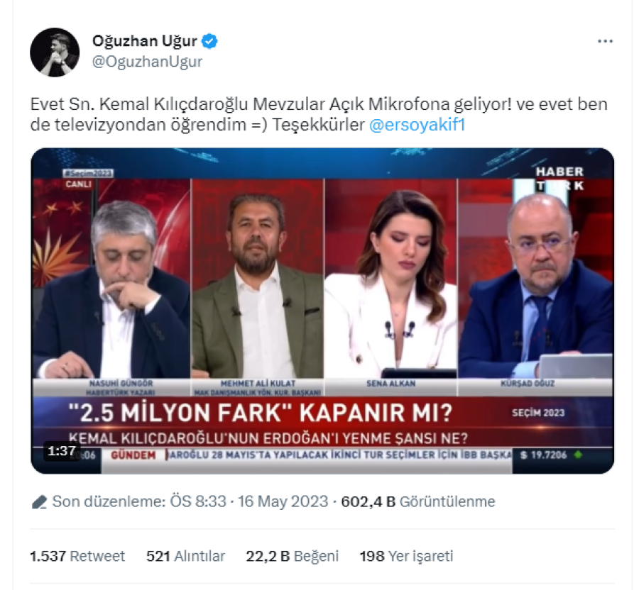 Oğuzhan Uğur da, "Evet Sn. Kemal Kılıçdaroğlu Mevzular Açık Mikrofona geliyor! ve evet ben de televizyondan öğrendim =)" dedi.
