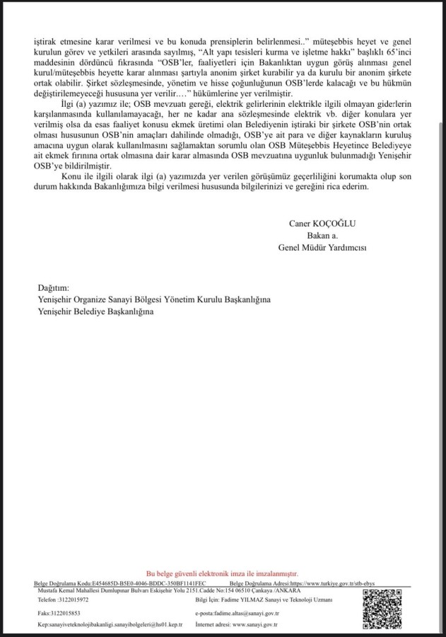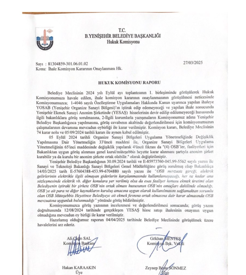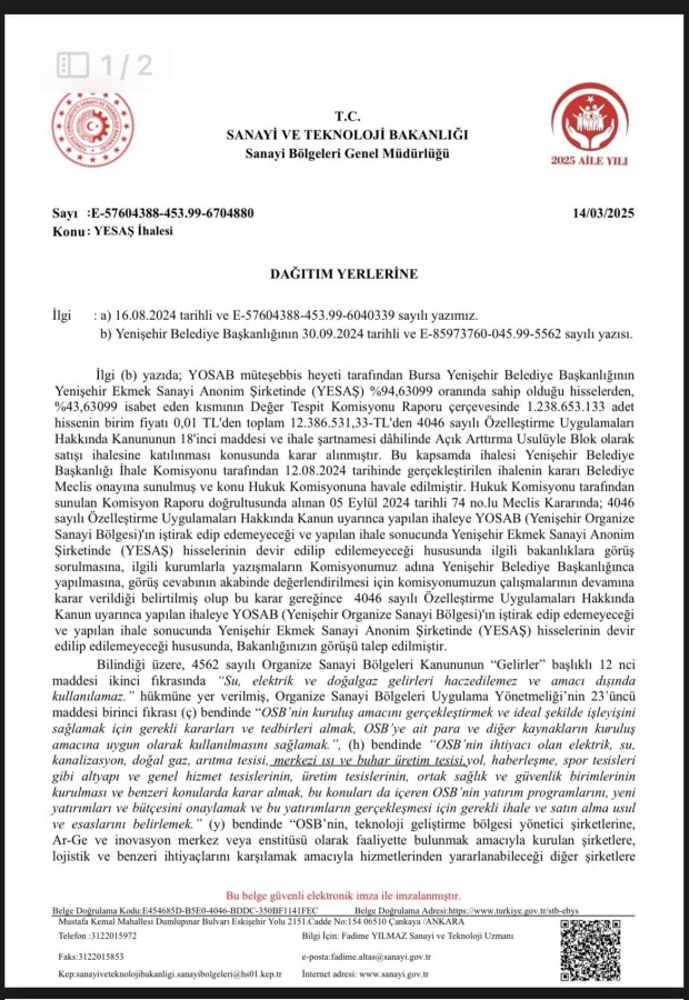 Gelinen noktada; Sanayi Bakanlığı tarafından YESAŞ'ın satılamayacağı, daha doğrusu YOSAB'ın YESAŞ'ı alamayacağı resmi yazı ile Yenişehir Belediyesine bildirilmiştir. Tarih, hukuk ve Sanayi Bakanlığı yazısı MHP Grubunu haklı çıkarmıştır.