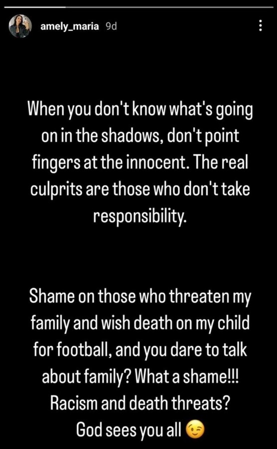 Ailemi tehdit edenler ve futbol için çocuğumun ölümünü isteyenler utansın ve siz aileden bahsetmeye cüret ediyorsunuz? Ne utanç verici!!! Irkçılık ve ölüm tehditleri mi? Tanrı hepinizi görüyor."