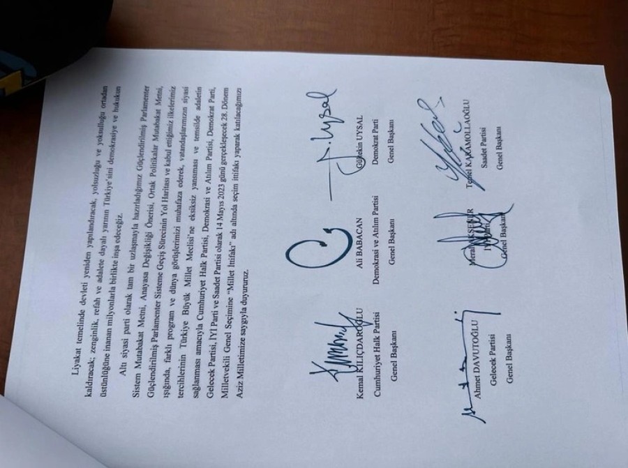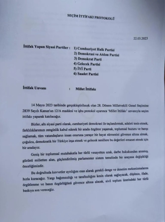 CHP Genel Başkanı Kemal Kılıçdaroğlu, DEVA Partisi Genel Başkanı Ali Babacan, Demokrat Parti Genel Başkanı Gültekin Uysal, Gelecek Partisi Genel Başkanı Ahmet Davutoğlu, İYİ Parti Genel Başkanı Meral Akşener ve Saadet Partisi Genel Başkanı Temel Karamollaoğlu'nun imzalarının bulunduğu ittifak protokolü, Millet İttifakı'na mensup 6 siyasi partinin genel başkan yardımcıları tarafından YSK'ya sunuldu.