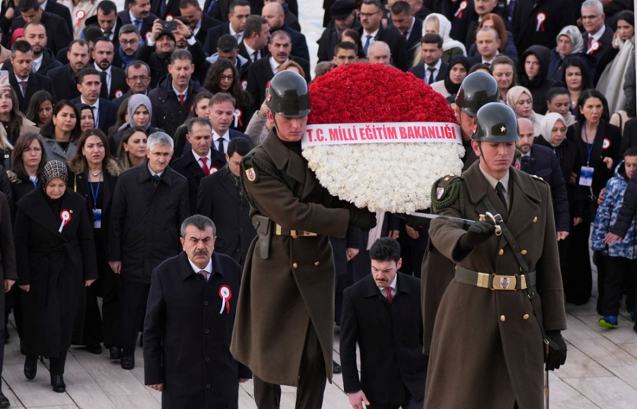 Tekin başkanlığındaki Bakanlık bürokratları ile öğretmenlerden oluşan heyet, Aslanlı Yol'dan yürüyerek Gazi Mustafa Kemal Atatürk'ün mozolesine geldi.