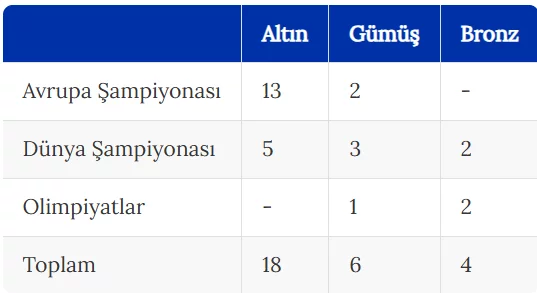 Milli sporcunun, toplam 28 madalya kazandığı Avrupa ve dünya şampiyonaları ile olimpiyatlarda elde ettiği başarılar şöyle: