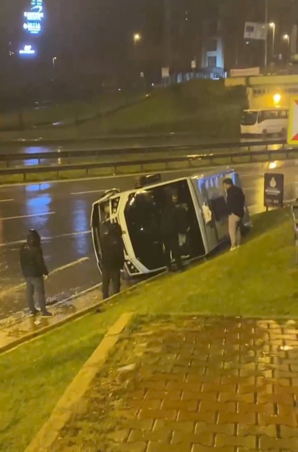 İddiaya göre, şiddetli yağışın etkisiyle birlikte kaygan zeminde şoförünün direksiyonu hakimiyetini kaybettiği minibüs yan yattı.
