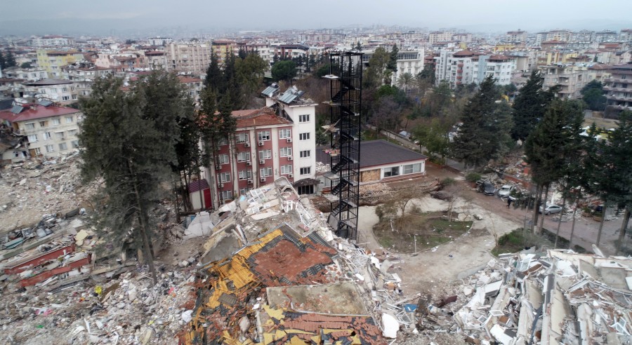 Kahramanmaraş merkezli 2 depremde hasar gören birçok bina, dün akşam saatlerinde 3 dakika arayla meydana gelen 6.4 ve 5.8'lik depremlerde yıkıldı. Bu binalardan Mustafa Kemal Üniversitesi Mimarlık Fakültesi misafirhanesinin ise sadece yangın merdiveninin ayakta kaldığı görüldü.
