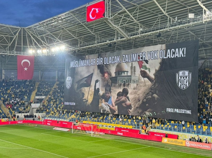 Trendyol Süper Lig'in 35. haftasında oynanan MKE Ankaragücü-Corendon Alanyaspor maçında, sarı-lacivertli taraftarlar İsrail'in Filistin'e saldırılarını kınadı.