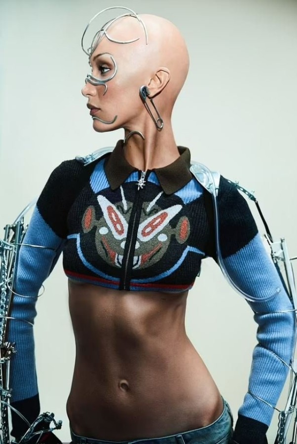 Bir başka fotoğrafta ise model tamamen çıplak, sadece gümüş bir kulak takısı ve omurgasından çıkan gümüş bir uzaylı dokunaçla görüldü.