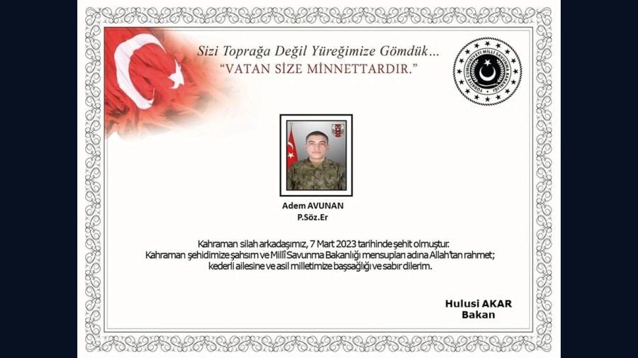 Milli Savunma Bakanlığı yaptığı açıklamada, "18 Şubat 2023 tarihinde Pençe-Kilit operasyonu bölgesinde meydana gelen silah kazası sonrasında yaralanarak hastanede tedavi altına alınan kahraman silah arkadaşımız P.Söz.Er Adem AVUNAN, tedavi gördüğü hastanede yapılan tüm müdahalelere rağmen kurtarılamayarak 07 Mart 2023 tarihinde şehit olmuştur" ifadelerini kullandı.