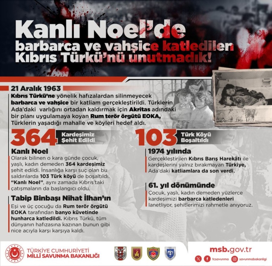 Bakanlığın sosyal medya hesabından yapılan açıklamada, "Kanlı Noel" olarak bilinen vahşice olaylarda çocuk, yaşlı, kadın demeden Kıbrıs Türkünü barbarca katleden Rum teröristleri lanetliyor, şehitlerimizi rahmetle anıyoruz" denildi.