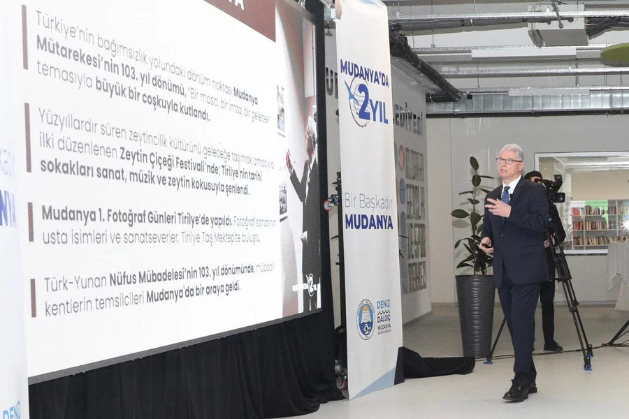 Mudanya Belediye Başkanı Deniz Dalgıç, 31 Mart 2024 yerel seçimlerinin ardından geçen iki yılı Mudanya Gençlik ve Spor Merkezi'nde düzenlenen toplantıda kapsamlı bir sunumla anlattı. Toplantıya, meclis üyeleri, muhtarlar, siyasi partiler ve sivil toplum kuruluşlarının temsilcileri ile basın mensupları ve vatandaşlar katıldı.