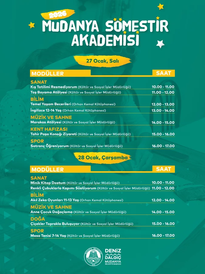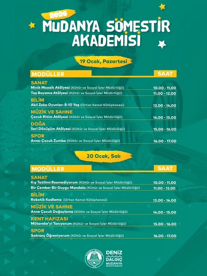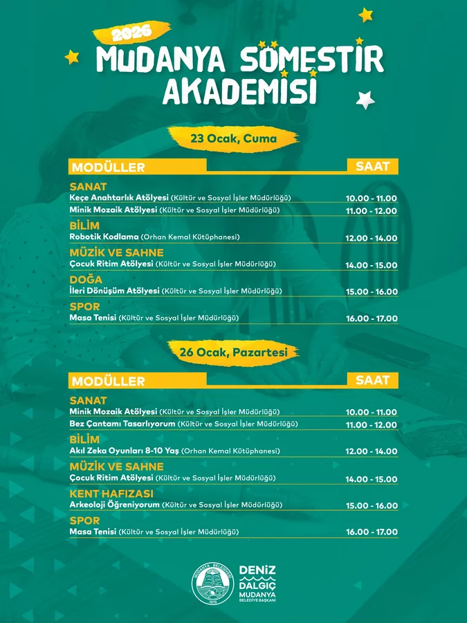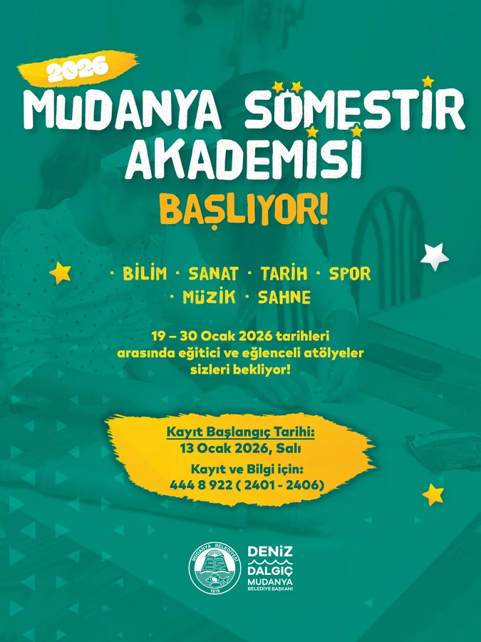 Mudanya Belediyesi, eğitim-öğretim yılının ilk dönemini tamamlayan öğrenciler için kapsamlı bir tatil programı hazırladı. 19-30 Ocak tarihleri arasında düzenlenecek olan Mudanya Sömestir Akademisi'nde her gün; Sanat, Bilim, Sahne ve Müzik, Doğa-Kent Hafızası ve Spor modülleri kapsamında sayısız atölye, ders ve gezi gerçekleştirilecek. Robotik kodlama, zeka oyunları, satranç, el sanatları, yazarlık, masa tenisi, ritim, İngilizce ve temel yaşam becerileri gibi birçok farklı atölyenin yer alacağı programda çocuklar, Mudanya'nın tarihi ve kültürel değerlerini de tanıma fırsatı bulacak.