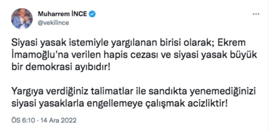 Muharrem İnce, İBB Başkanı Ekrem İmamoğlu'nun 2 yıl 7 ay 15 gün hapis cezası ve siyasi yasak almasının ardından sosyal medya hesabından paylaşımda bulundu.