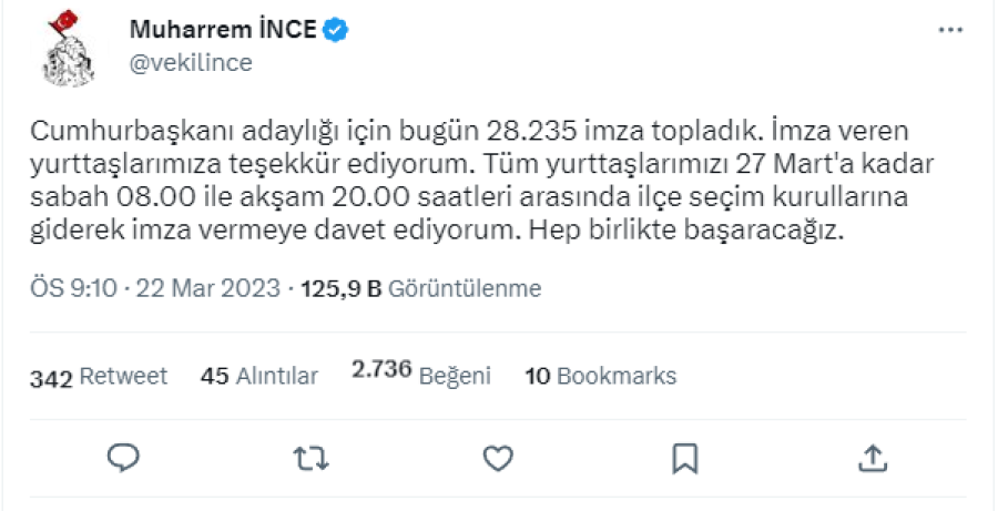 "Cumhurbaşkanı adaylığı için bugün 28.235 imza topladık. İmza veren yurttaşlarımıza teşekkür ediyorum. Tüm yurttaşlarımızı 27 Mart'a kadar sabah 08.00 ile akşam 20.00 saatleri arasında ilçe seçim kurullarına giderek imza vermeye davet ediyorum. Hep birlikte başaracağız."