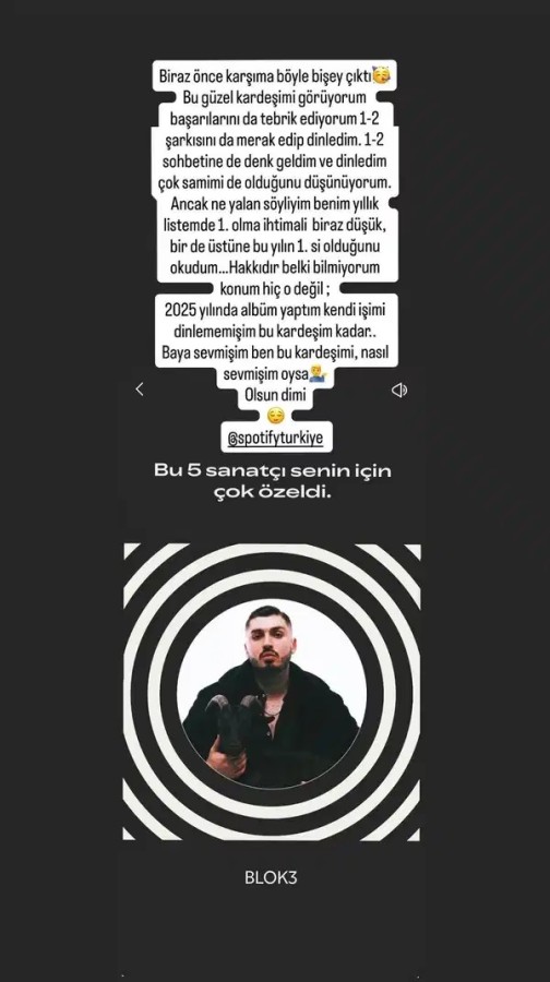 Ünlü şarkıcı Murat Dalkılıç, 2025 Spotify özetini sosyal medya hesabından paylaşarak platforma dikkat çeken bir eleştiride bulundu. Yıl içinde en çok dinlediği ismin Blok3 adıyla bilinen rapçi Hakan Aydın çıkmasına şaşırdığını belirten Dalkılıç, yaptığı paylaşımda hem şaşkınlığını hem de sitemini dile getirdi.