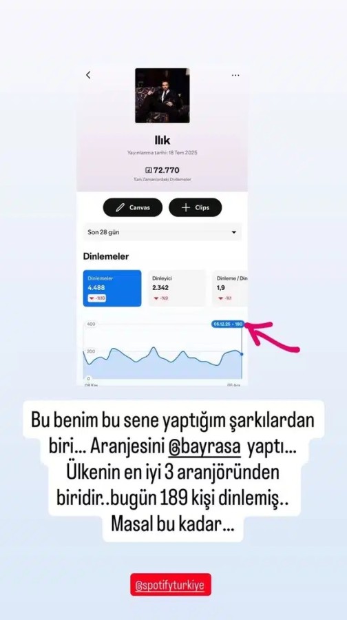 Şarkıcı, bu yıl yayınladığı Ilık şarkısının dinlenme sayısından duyduğu memnuniyetsizliği de belirtti. Dalkılıç, "Bu benim bu sene yaptığım şarkılardan biri... Bugün 189 kişi dinlemiş... Masal bu kadar..." sözleriyle Spotify algoritmasına gönderme yaptı.