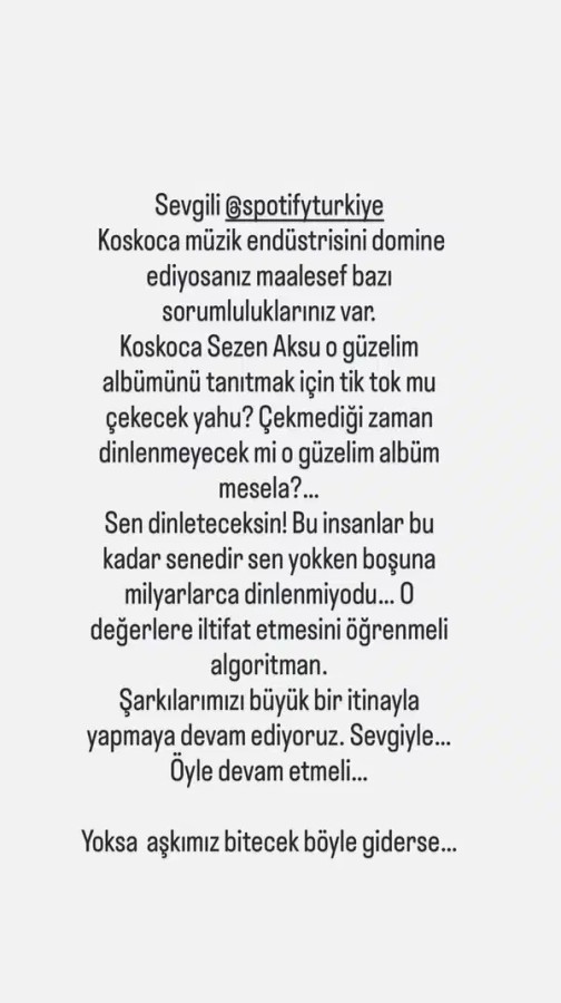 Dalkılıç, Spotify Türkiye'yi müzik endüstrisine karşı sorumluluklarını yerine getirmeye çağırdı. "Koskoca Sezen Aksu o güzelim albümünü tanıtmak için TikTok mu çekecek yahu? Çekmediği zaman dinlenmeyecek mi o albüm? Sen dinleteceksin!" diyen şarkıcı, platform algoritmalarının müzik değerlerine uygun şekilde düzenlenmesi gerektiğini vurguladı.