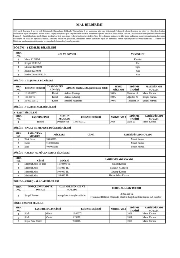 Buna göre, AK Parti'nin İstanbul adayı Murat Kurum'un Ankara Çankaya'da kendi adına bir evi, Ankara Altındağ'da bir evi, yine İstanbul Kağıthane'de oturdukları bir evleri bir de arabaları bulunuyor.