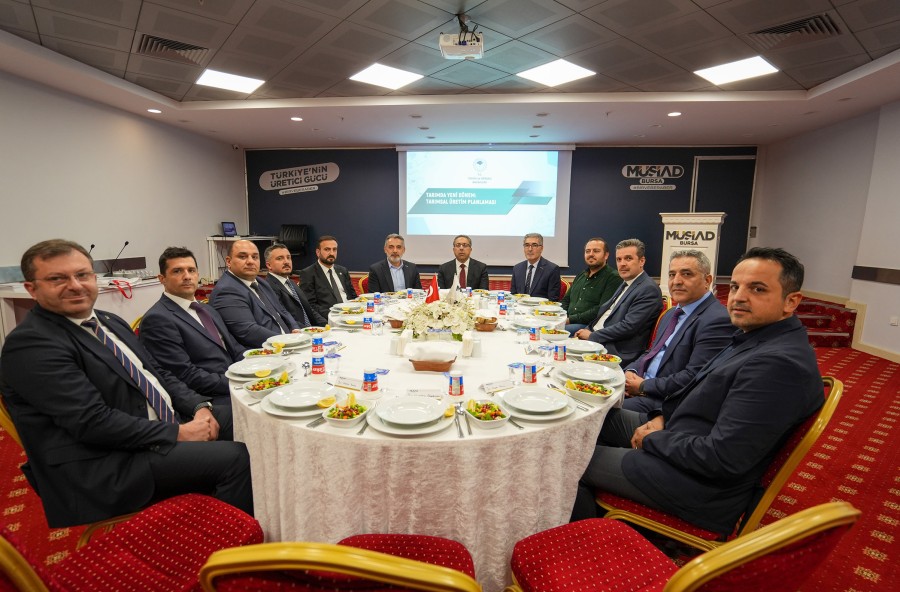 Sektör temsilcilerinin yoğun ilgi gösterdiği toplantıda, Türkiye'nin yeni tarım vizyonu, gıda enflasyonu ile mücadele ve sürdürülebilir üretim modelleri ele alındı. MÜSİAD Bursa Şubesi'nde gerçekleştirilen toplantıya; MÜSİAD Bursa Başkanı Alparslan Şenocak'ın ev sahipliğinde, MÜSİAD Bursa Tarım, Gıda ve Hayvancılık Sektör Kurulu Başkanı Tayfun Kurdal, Bursa Ticaret Borsası Meclis Başkanı Mustafa Aksu, Uludağ Gümrük ve Dış Ticaret Bölge Müdürü Mehmet Tuncay Bayraktar ile kamu kurumlarının ve sivil toplum kuruluşlarının temsilcileri katıldı.