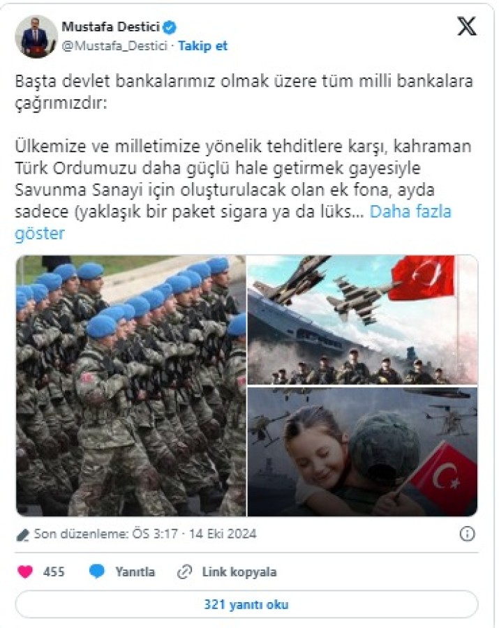 "Başta devlet bankalarımız olmak üzere tüm milli bankalara çağrımızdır: Ülkemize ve milletimize yönelik tehditlere karşı, kahraman Türk Ordumuzu daha güçlü hale getirmek gayesiyle Savunma Sanayi için oluşturulacak olan ek fona, ayda sadece (yaklaşık bir paket sigara ya da lüks kafelerde bir bardak çay parası olan) 62.5 lira, yılda 750 lira vermemek için, kredi kartlarının limitlerini 100.000 liradan 99.000 liraya düşüren, yüksek gelirlere sahip, "savunma sanayimizin gelişmesine direnç oluşturmaya çalışan", başta bir konserden milyonlar alan hayırsız sanatçılar ile dolarla maaş alan medya mensuplarının ve bunu yapan siyasetçilerin kredi kartlarını lütfen iptal ediniz."