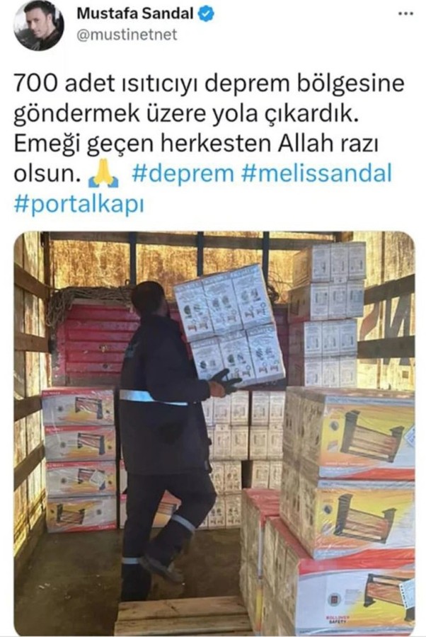 Twitter hesabından paylaşım yapan Sandal, eşi Melis Sandal'ı da etiketleyip, "700 adet ısıtıcıyı deprem bölgesine göndermek üzere yola çıkardık. Emeği geçen herkesten Allah razı olsun" mesajını yazdı.
