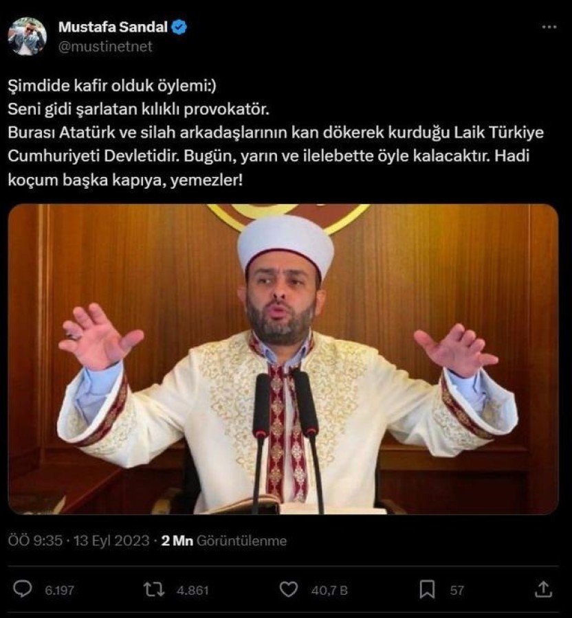 "Acilen müslümanla kafirin tanımı yapılsın. Dine girmek var, çıkmak da var... Bunu sokacağız akıllarına anlata anlata. Bizim görevimiz beyinlerini çatlatırcasına anlatmak. Müslüman buna denir, kafir buna denir" ifadelerini kullanan imama Mustafa Sandal sert çıktı.