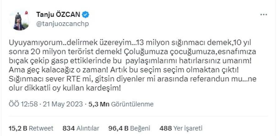 "Uyuyamıyorum..delirmek üzereyim...13 milyon sığınmacı demek, 10 yıl sonra 20 milyon terörist demek! Çoluğumuza çocuğumuza, esnafımıza bıçak çekip gasp ettiklerinde bu paylaşımlarımı hatırlarsınız umarım! Ama geç kalacağız o zaman! Artık bu seçim seçim olmaktan çıktı! Sığınmacı sever RTE mi, gitsin diyenler mi arasında referandum mu...ne olur dikkatli oy kullan kardeşim!"