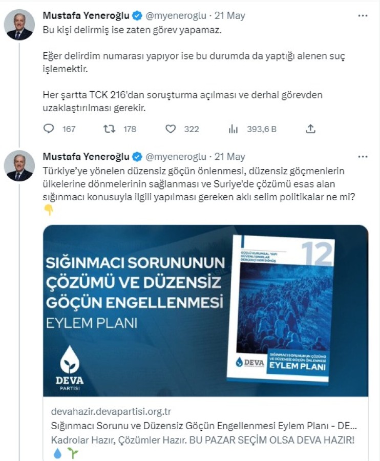 Yeneroğlu, "Sığınmacı ve düzensiz göç konusu aklı selim politikalarla yönetilmesi gerekir. Mesnetsiz verilerle akıl almaz iddialar ortaya atarak halkı kin ve düşmanlığa tahrik edip suç işleyen bu nazi kafasının yeri ya akıl hastanesi ya da cezaevi, kamu görevi yapması asla kabul edilemez!" ifadelerine yer verdi.