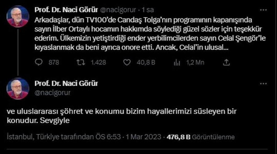 "Arkadaşlar, dün TV100'de Candaş Tolga'nın programının kapanışında sayın İlber Ortaylı hocamın hakkımda söylediği güzel sözler için teşekkür ederim. Ülkemizin yetiştirdiği ender yerbilimcilerden sayın Celal Şengör'le kıyaslanmak da beni ayrıca onore etti. Ancak, Celal'in ulusal ve uluslararası şöhret ve konumu bizim hayallerimizi süsleyen bir konudur. Sevgiyle"