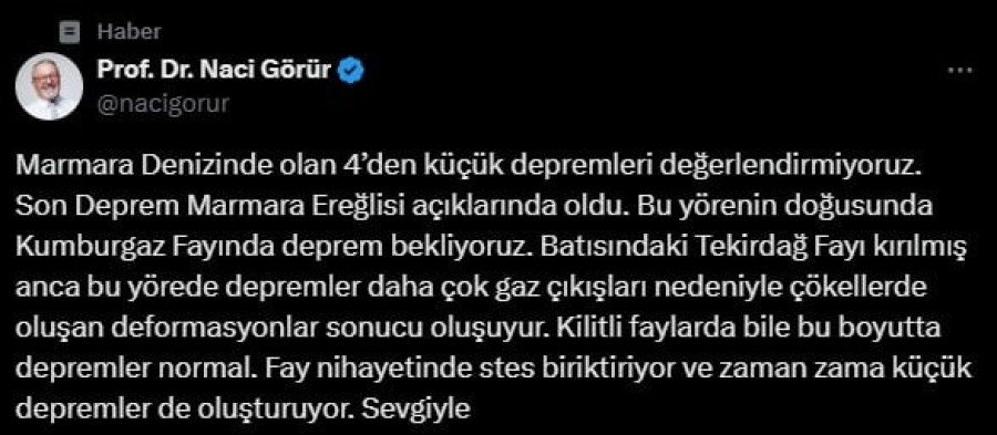 Prof. Dr. Görür, beklenen Marmara Depremi'ne ilişkin sosyal medya hesabından yaptığı paylaşımda, "Marmara Denizinde olan 4'den küçük depremleri değerlendirmiyoruz" diyerek şu ifadeleri kullandı: