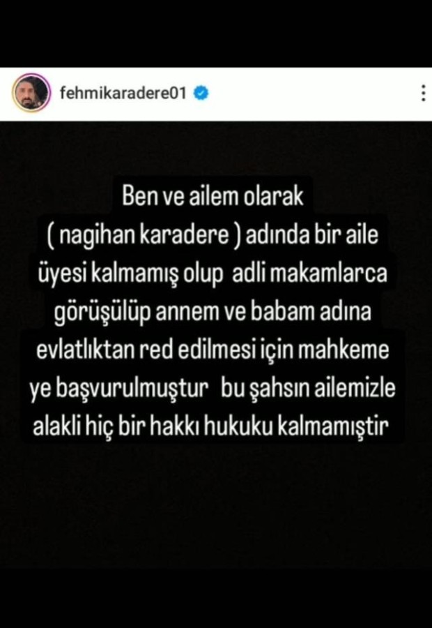 Fehmi Karadere Nagihan Karedere'nin evlatlıktan red edilmesi için anne ve babasının mahkemeye başvurduğunu iddia etti.