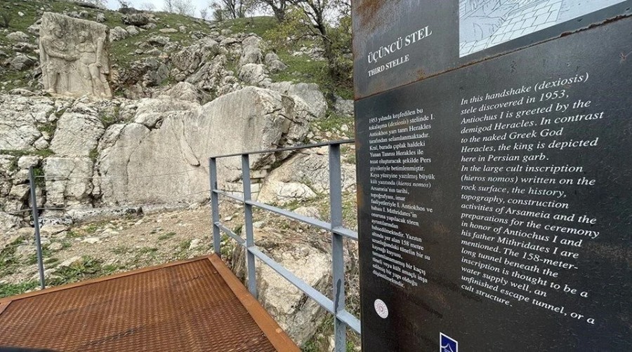 Depremlerden önce turistlerin uğrak noktaları arasında yer alan, üzerinde Komagene Kralı Antiokhos ile Yunan mitolojisinin kahramanlarından Herakles'i tokalaşırken betimleyen kabartma bulunan yaklaşık 3 metre yüksekliğinde, 2 metre enindeki taş blokun (stel), depremlerde zarar görmediği belirlendi.