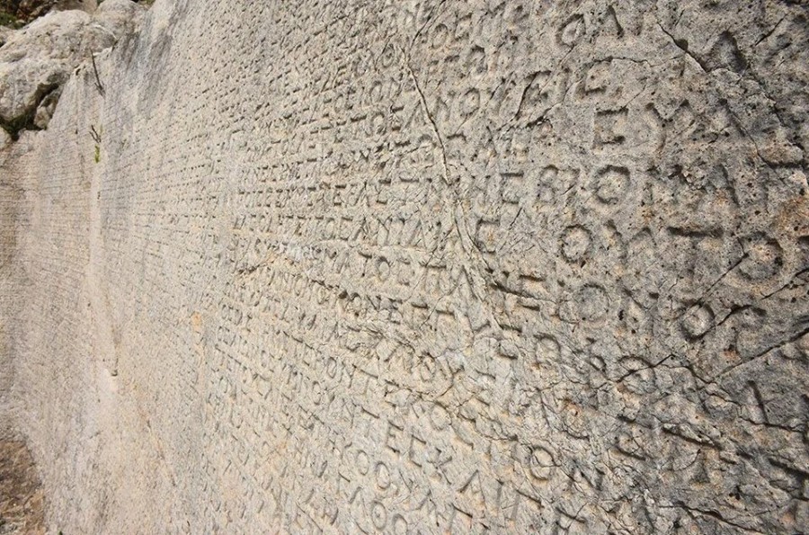"1953 yılında keşfedilen bu tokalaşma stelinde 1. Antiokhos, yarı tanrı Herakles tarafından selamlanmaktadır. Kral, burada çıplak haldeki Yunan tanrısı Herakles ile tezat oluşturacak şekilde Pers giysileriyle betimlenmişti. Kaya yüzeyinde yazılmış kült yazıtında Asrameia'nın tarihi, topografyası, imar faaliyetleriyle 1. Antiokhos ve babası 1. Mithridates'in onuruna yapılacak tören ayrıntılarından bahsedilmektedir. Yazıtın altında yer alan 158 metre uzunluğundaki tünelin bir su kaynağı kuyusu, tamamlanamamış bir kaçış tüneli ve kült amaçlı inşa edilmiş bir yapı olduğu düşünülmektedir."