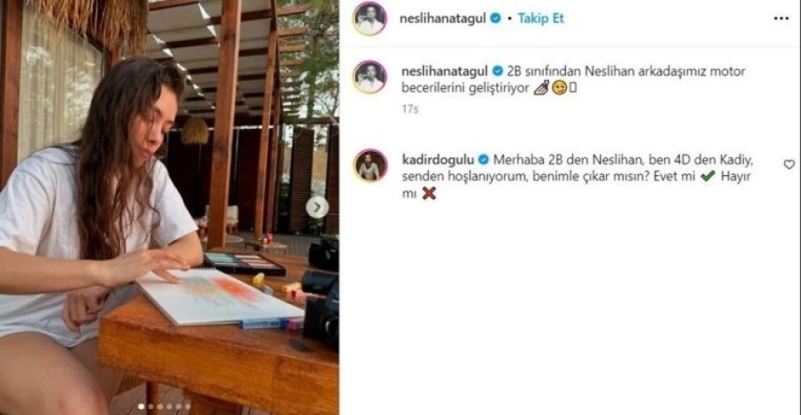 Doğulu, eşinin fotoğrafına "Merhaba 2-B'den Neslihan, ben 4-D'den Kadiy, senden hoşlanıyorum, benimle çıkar mısın? Evet mi, hayır mı?" yorumunu yapmıştı.