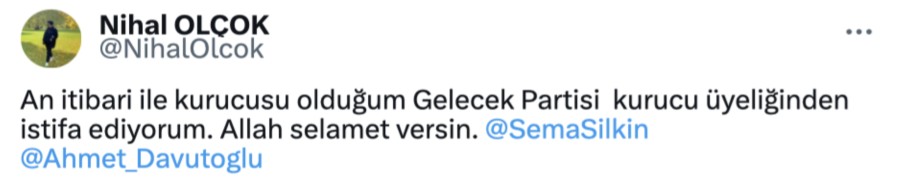 Olçok, paylaşımında "An itibari ile kurucusu olduğum Gelecek Partisi kurucu üyeliğinden istifa ediyorum. Allah selamet versin" ifadelerine yer verdi.