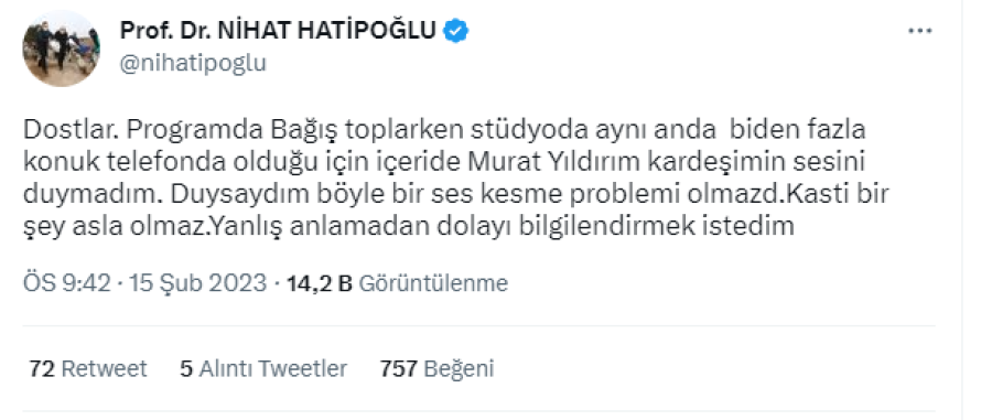 "Dostlar. Programda Bağış toplarken stüdyoda aynı anda biden fazla konuk telefonda olduğu için içeride Murat Yıldırım kardeşimin sesini duymadım. Duysaydım böyle bir ses kesme problemi olmazdı. Kasti bir şey asla olmaz. Yanlış anlamadan dolayı bilgilendirmek istedim"