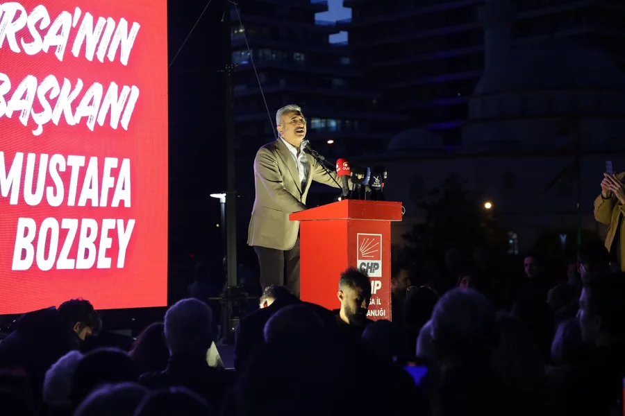 Bu ne demek biliyor musunuz? Bu, sıradan bir seçim sonucu değildir! Bu, Bursa'nın çok net, çok güçlü bir irade beyanıdır! Bu, her iki Bursalıdan birinin "Benim başkanım Mustafa Bozbey'dir" demesidir! Peki şimdi soruyorum size...Başkanımız yaptığı hizmetler için mi cezalandırılıyor? Bozbey'in suçu ; Çocuklarımız için kreşler açmak mı, Bozbey'in suçu, yarattığınız yoksulluğa kent lokantaları ile merhem olmak mı? Bozbey'in suçu zehir saçan asbestli boruları değiştirip, halkın sağlığını düşünmek mi? Yoksa Bozbey'in suçu yaptığı indirimlerle Türkiye'nin en ucuz öğrenci taşımacılığını gerçekleştirmek mi? Yoksa Bozbey'in suçu ağır enflasyon altında yaşam mücadelesi veren gençlerimiz için açtığı Burfaş kafelerle nefes olmak mı? Yoksa Bozbey'in suçu tamamlayamadığınız Çınarcık barajını devreye sokup Bursa'nın su sorununu kökten çözmek mi? Yoksa ; Bozbey'in suçu çiftçiye emekliye destek olacak sayısız projeyi hayata geçirmek mi?