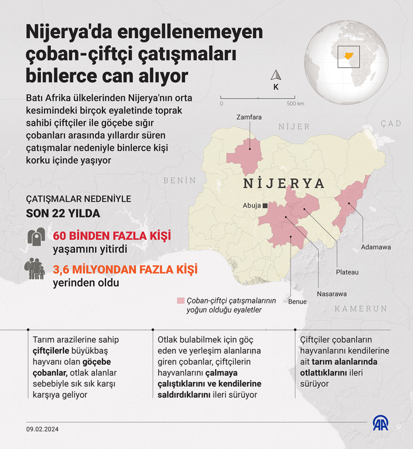 Özellikle Zamfara, Benue, Plateau, Adamawa ve Nasarawa eyaletlerinde çoban-çiftçi çatışmalarına bağlı arazi anlaşmazlıkları, sığır hırsızlıkları ve kitlesel şiddet olayları, milyonlarca insanı evlerinden etti.