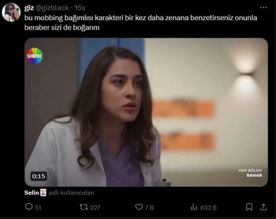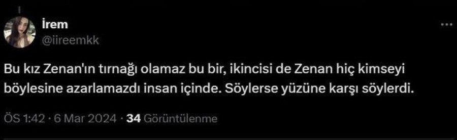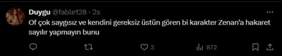 Zenan hayranları "Bu mobbing bağımlısı karakteri bir kez daha Zenan'a benzetirseniz onunla beraber sizi de boğarım" yorumlarında bulundu.