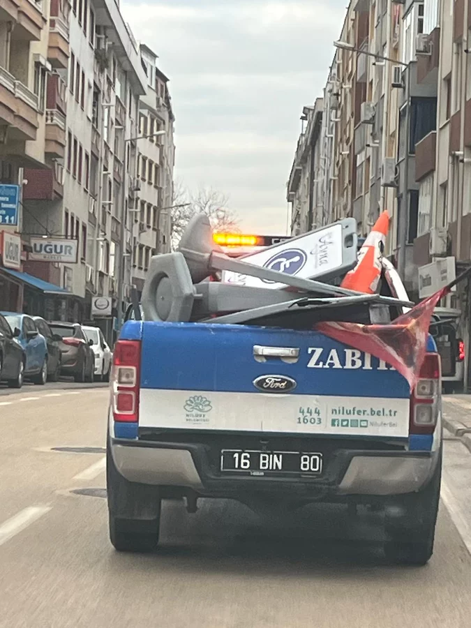 Nilüfer Belediyesi ekipleri; Esentepe ve Karaman mahalleleri ile Beşevler ve Yıldırım caddeleri üzerinde yaya geçişini engelleyen ve görüntü kirliliği oluşturan duba, tabela ve reklam materyallerini topladı.