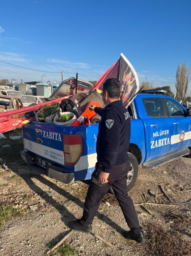 Nilüfer Belediyesi Zabıta Müdürlüğü, 23 araç ve 100 personelin görev aldığı çalışmada ilçe genelinde kamu kullanımına açık alanları daraltan ve kentsel estetiğini bozan materyalleri yasal prosedür çerçevesinde topladı.