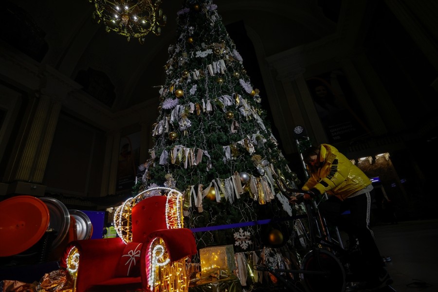 Kiev Tren İstasyonu'nda kurulan Noel ağacının yanına monte edilen özel bisiklete binenlerin pedal çevirmesi sonucu ağaçtaki ışıklar yanıyor.
