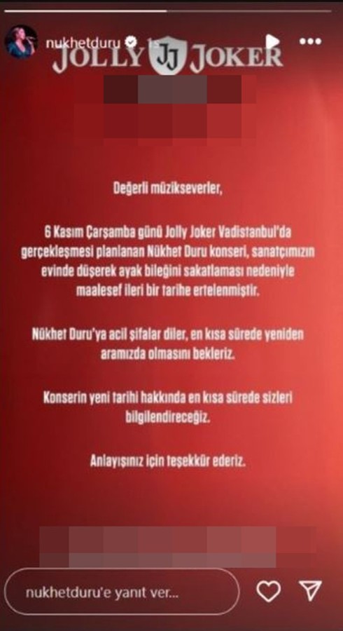 Yapılan açıklamada, Duru'nun sakatlığı nedeniyle 6 Kasım'da gerçekleşmesi planlanan konserin ertelendiği belirtilerek, "Çarşamba günü yapılması planlanan Nükhet Duru konseri, sanatçımızın evde düşerek ayak bileğini sakatlaması nedeniyle ileri bir tarihe ertelenmiştir" ifadesi kullanıldı.