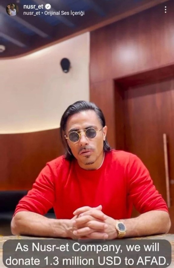 "Evet. Buradan bütün Dünya'ya sesleniyorum. O gün bugün. Acımız büyük. Birlik ve beraberlik zamanı. Türkiye'miz için. Nusret markası olarak AFAD'a 25 milyon TL bağışta bulunuyoruz. Haydi Türkiye'm. El ele, gönül gönüle. Biz beraberiz. Biz Türkiye'yiz."
