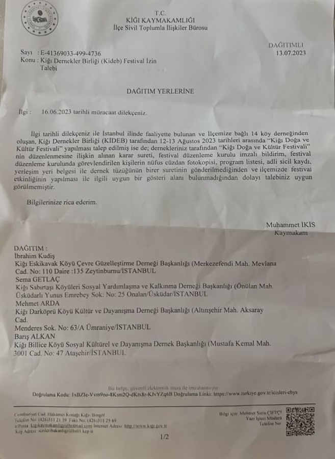 Kiğı Dernekler Birliği (KİDEB) tarafından 12-13 Ağustos tarihlerinde düzenlenmek istenen Doğa ve Kültür Festivali, belge eksikliği ve 'festival alanı bulunmadığı' gerekçeleriyle Kiğı Kaymakamlığı tarafından iptal edildi.
