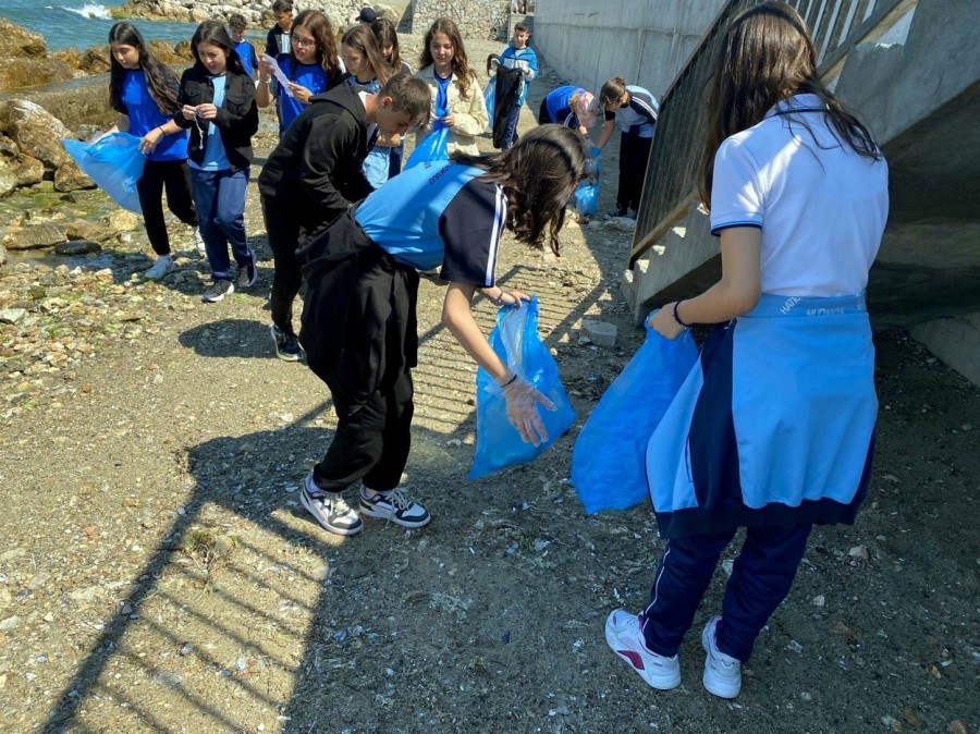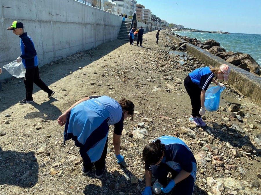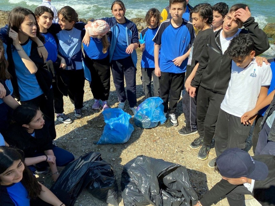 Sahil boyunca biriken çöpleri toplayan öğrenciler, plastik atıklardan şişelere, kağıt ve diğer çöplere kadar sahili temizleyerek, çevre kirliliğine dikkat çekti.