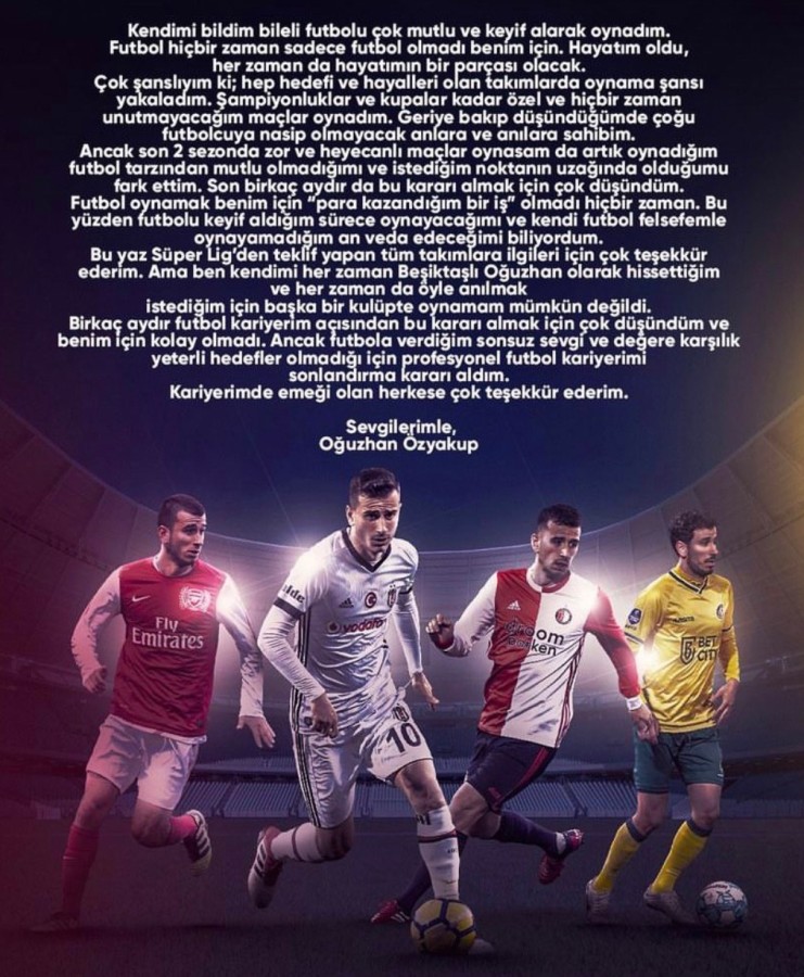 Oğuzhan Özyakup emeklilik kararı açıklamasında; "Bu yaz Süper Lig'den teklif yapan tüm takımlara ilgileri için çok teşekkür ederim. Ama ben kendimi her zaman Beşiktaşlı Oğuzhan olarak hissettiğim ve her zaman öyle anılmak istediğim için başka bir kulüpte oynamam mümkün değildi. Futbola verdiğim sonsuz değere karşılık yeterli hedefler olmadığı için profesyonel futbol kariyerimi sonlandırma kararı aldım." ifadelerini kullandı.