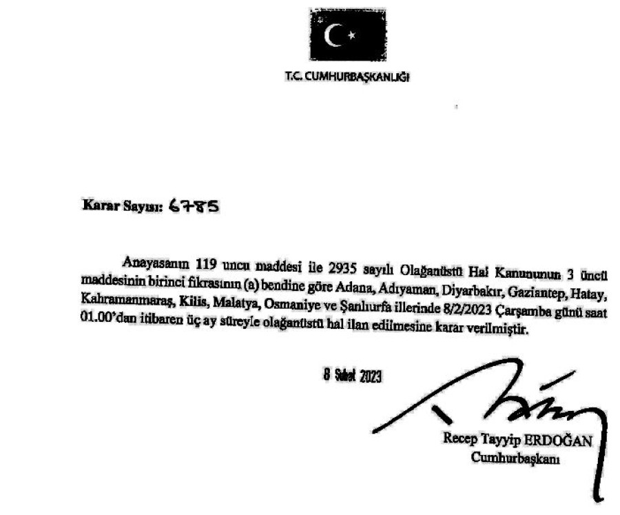 Cumhurbaşkanı Recep Tayyip Erdoğan Kahramanmaraş merkezli 6 Şubat büyük depreminde 10 ilde yaşanan ağır yıkım nedeniyle; Adana, Adıyaman, Diyarbakır, Gaziantep, Hatay, Kahramanmaraş, Kilis, Malatya, Osmaniye ve Şanlıurfa illerini kapsayacak şekilde 3 aylığına OHAL ilan edilmesi kararı aldı.
