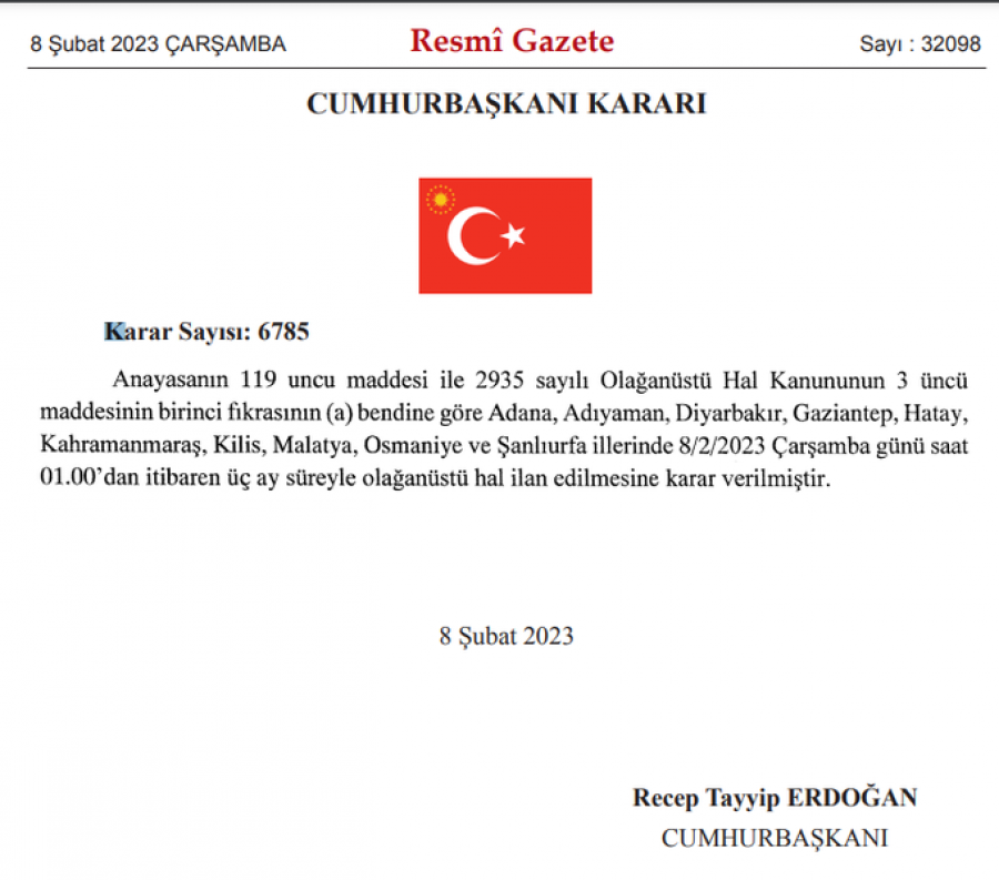 Depremin yaşandığı 10 ilde OHAL kararı Resmi Gazete'de yayımlanarak yürürlüğe girdi.
