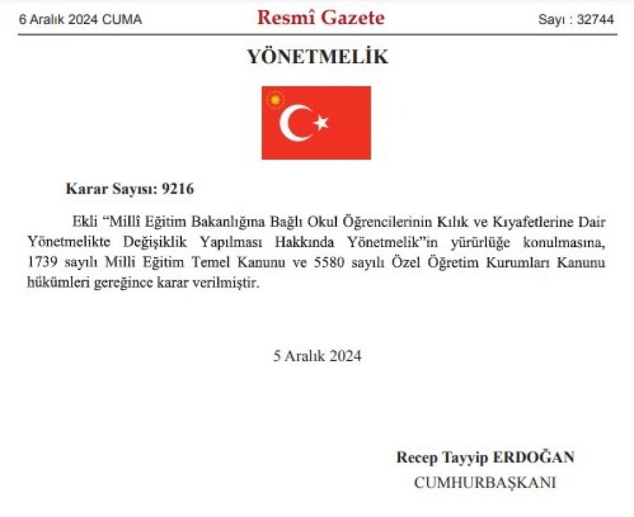 Milli Eğitim Bakanlığına (MEB) bağlı okul öğrencilerinin kılık ve kıyafetlerine dair yönetmelikte değişiklik yapıldı. Cumhurbaşkanı ve AKP Genel Başkanı Recep Tayyip Erdoğan imzalı yeni yönetmelik, 1739 sayılı Milli Eğitim Temel Kanunu ve 5580 sayılı Özel Öğretim Kurumları Kanunu hükümleri gereğince bu gece yürürlüğe konuldu.