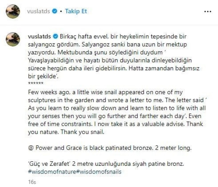 "Bir kaç hafta evvel bir heykelin tepesinde bir salyangoz gördüm. Salyangoz sanki bana uzun bir mektup yazıyordu.
